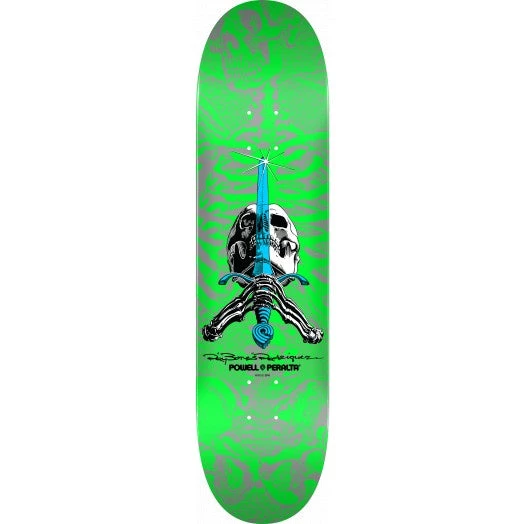 The Rodriguez “Skull & Sword” deck was the first pro signature deck graphic produced by Powell-Peralta. The graphic was conceived by Ray and Illustrated by V.C. Johnson with art direction from George Powell in 1979.