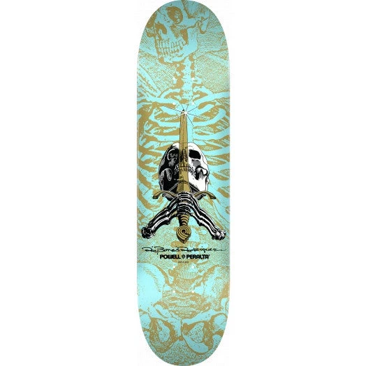 The Rodriguez “Skull & Sword” deck was the first pro signature deck graphic produced by Powell-Peralta. The graphic was conceived by Ray and Illustrated by V.C. Johnson with art direction from George Powell in 1979.