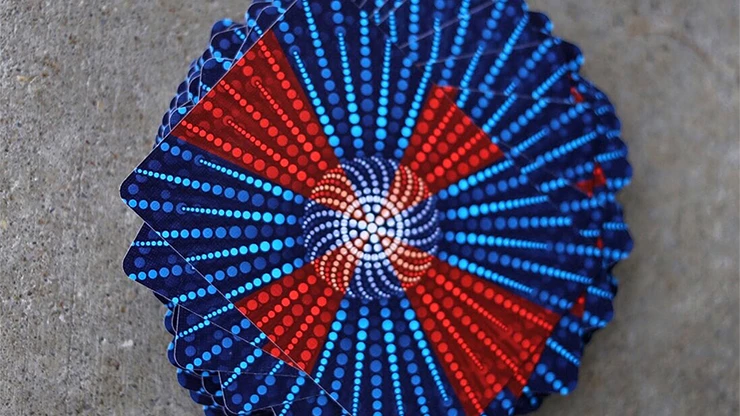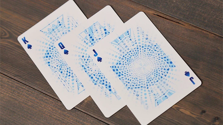 The court cards each have a radial design structure that gives an abstract, yet familiar, look to them. The PIPS and Indices have a non-typical red (Hearts/Diamonds) and blue (Clubs/Spades) color combo, and are easy to read for maximum playability. This deck, then, can become part of your everyday carry, as you can practice cardistry, magic and stealing money from your friends in a game of poker (no, it is not a marked deck).
