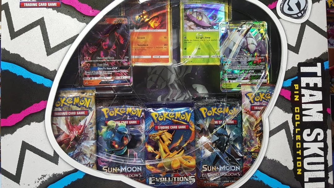 The Pokémon TCG: Team Skull Pin Collection includes: