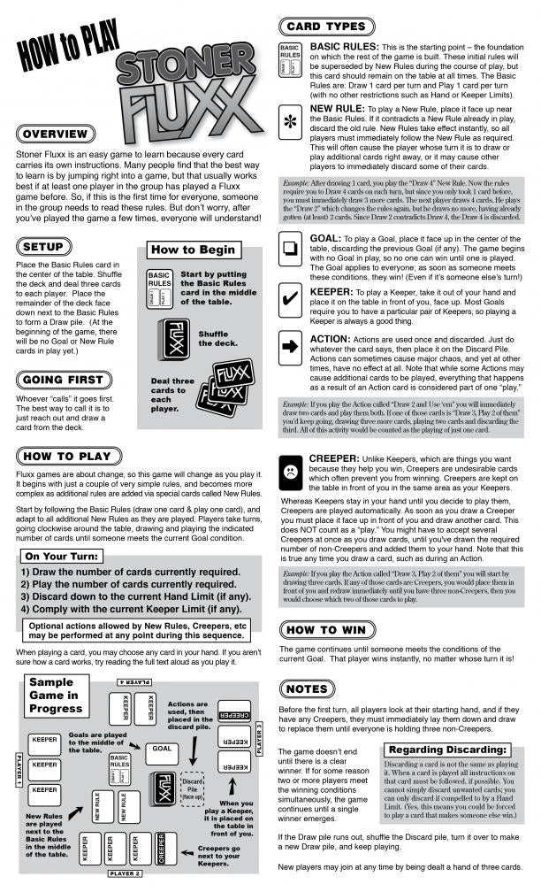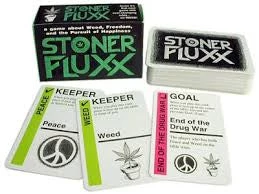 Stoner Fluxx is a marijuana-themed version of the hit card game Fluxx – it’s a game about toking with your friends, getting the munchies, and changing the rules. Back by popular demand, this bigger, bolder edition features 16 new cards (including three Creepers: Munchies, Dry Spell, and The Mooch) with new color artwork in a nicer, larger box.