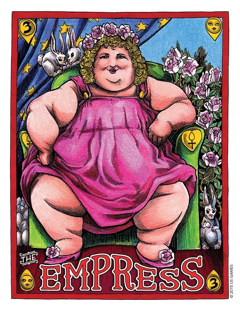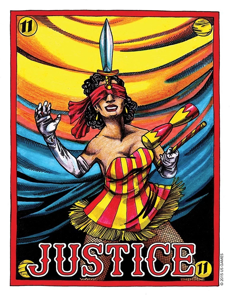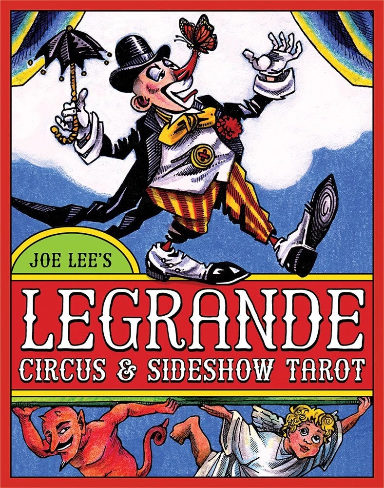 Filled with circus and sideshow lore, LeGrande Circus & Sideshow Tarot is set in the glitter and mud world of the mid-century truck show. The Major Arcana is colorfully illustrated in the bravura style of vintage circus posters. Each tarot archetype is represented by a corresponding icon of the circus: the Emperor as the ringmaster, the Hermit as a tramp clown, the Sun as the blazing figure of a tiger leaping through a ring of fire.