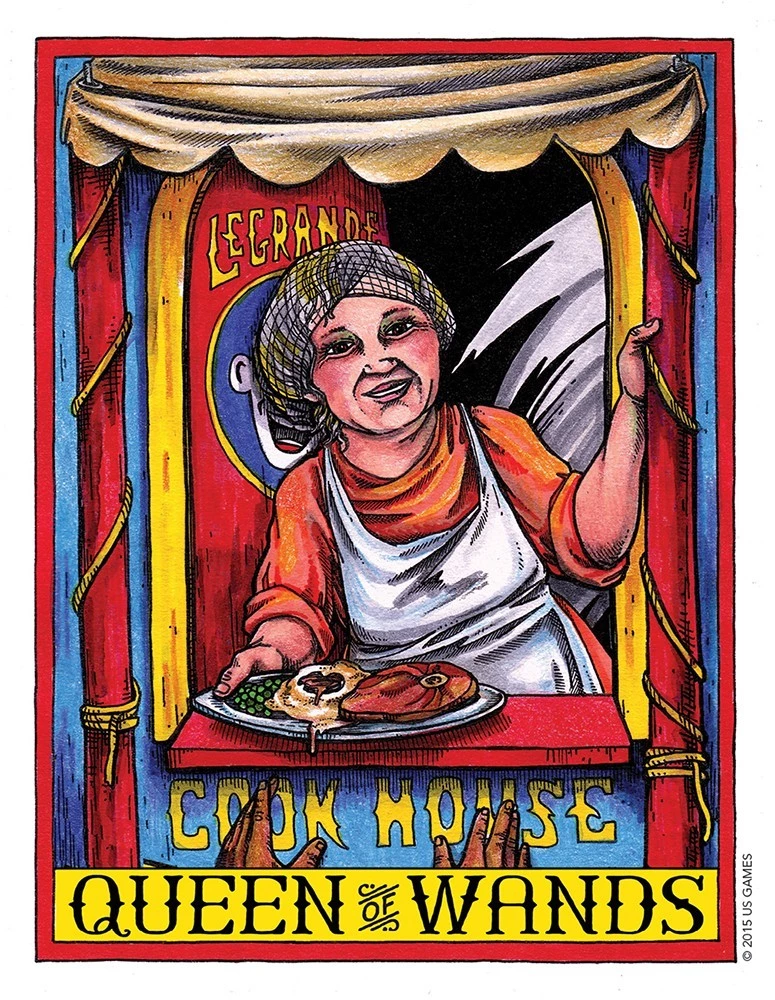 Joe’s life-long interest in the circus prompted him to create the LeGrand Circus Tarot deck. His vibrant artwork begins with black and white ink drawings, which he then colors with colored pencils, markers, and watercolors. The 78 cards showcase Joe’s talent as a cartoonist and are reminiscent of mid-century circus posters.