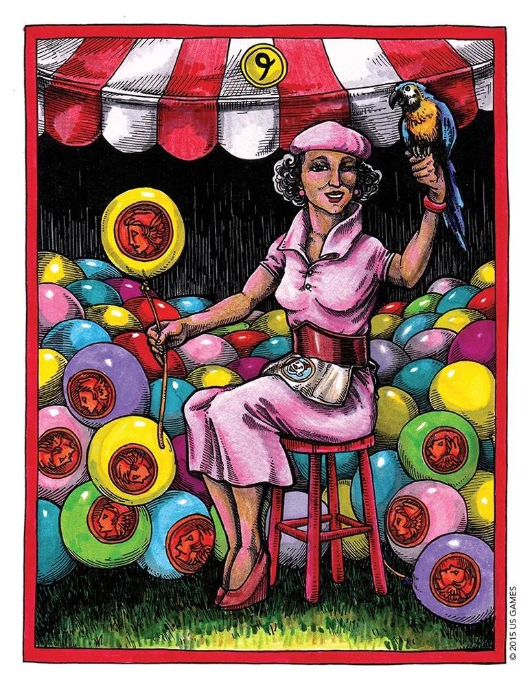 The Minor Arcana offers glimpses of the day-to-day life of the circus and sideshow with each suit representing a different aspect of life on the circus lot. The suit of Cups is the world of performance under the big top. The Swords are embedded deep in the bizarre and sometimes frightening heart of the sideshow. Each symbolically charged pasteboard will “step right up” and take the user deeper into this mysterious realm. The Coins represent the business of the show—the “front-end” with its managers keeping the troupe on the road and the “butcher” hawking his “floss” and popcorn in the stands. No one enters this realm of dreams without the work of the Wands, which conjure the backbreaking work of man and animal to raise the tent and create this palace of wonder. The stakes and tent-poles are the magic wands of this suit and no show can exist without the elemental magic of sweat and strain.