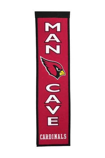 Arizona Cardinals Mancave Banner measures 8″ wide by 32″ long, made of wool and professionally embroidered.