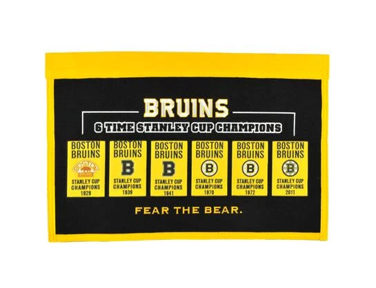 Boston Bruins Rafter Raiser Banner measures 22” wide by 14” tall, made of wool and professionally embroidered