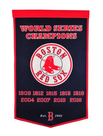 Boston Red Sox Dynasty Banner measures 24″ wide by 36″ long, made of wool and professionally embroidered.