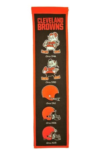 Cleveland Browns Heritage Banner measures 8” wide by 32” long and shows the progression of the team over the years. Made of wool and professionally embroidered