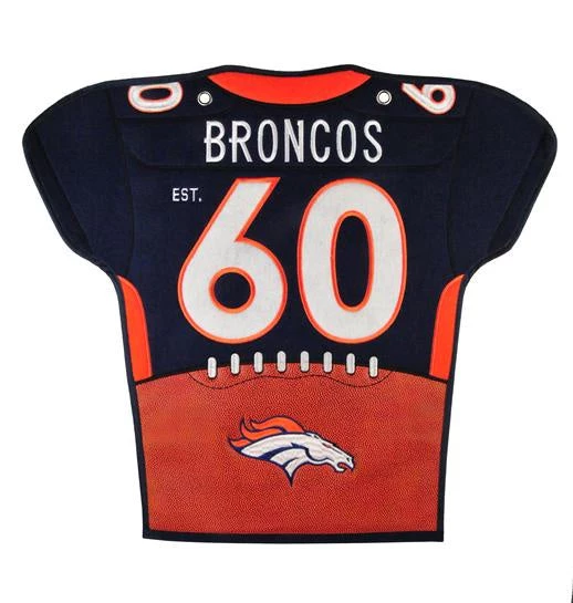 Denver Broncos Jersey Banner measures 20” wide by 18” long, made of wool and professionally embroidered. Includes an autographable area for your favorite Denver Broncos Player