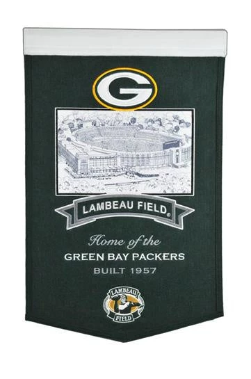 Lambert Field Stadium Banner is home to the world famous Green Bay Packers! Packers banner measures 15” wide by 24” long, made of wool and professionally embroidered