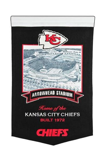 Arrowhead Stadium Banner is home to the Kansas City Chiefs! Measures 15” wide by 24” long, made of wool and professionally embroidered.