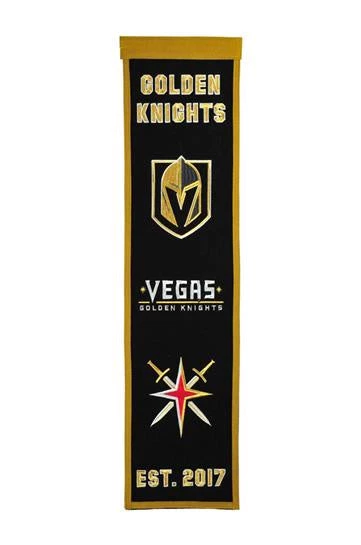 Las Vegas Golden Knights Heritage Banner measures 8” wide by 32” long, made of wool and professionally embroidered
