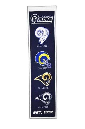 Los Angeles Rams Heritage Banner measures 8″ wide by 32″ long, made of wool and professionally embroidered.