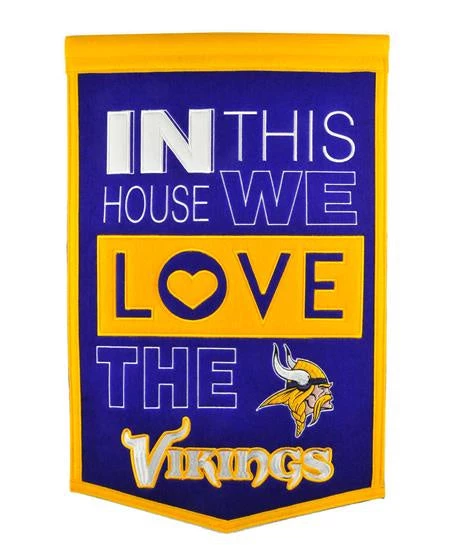 Minnesota Vikings – In This House We Love The Vikings banner measures 15” wide by 24” long and is made of wool and professionally embroidered