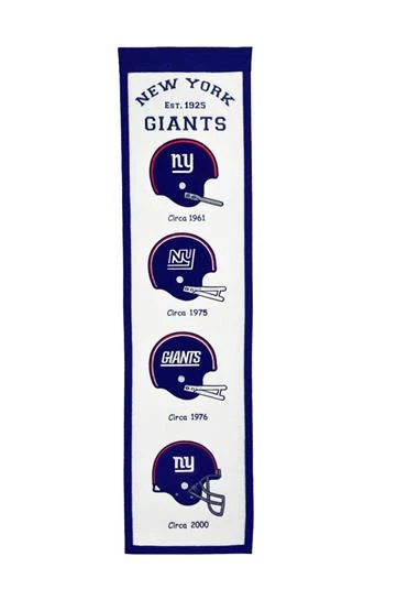 New York Giants Fan Favorite Heritage Banner measures 8” wide by 32” long, made of wool and professionally embroidered.