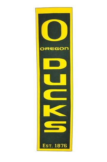 Oregon Ducks Heritage Banner measures 8” wide by 32” long, made of wool and professionally embroidered