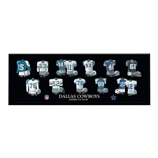 Dallas Cowboys Legacy Uniform Plaque shows the progression of the team uniform over the years. Measures 8” tall by 24″ long.