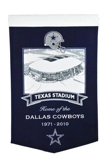 Dallas Cowboys Texas Stadium Banner. Home to the world famous Dallas Cowboys. Banner measures 15” wide by 24” long, made of wool and professionally embroidered