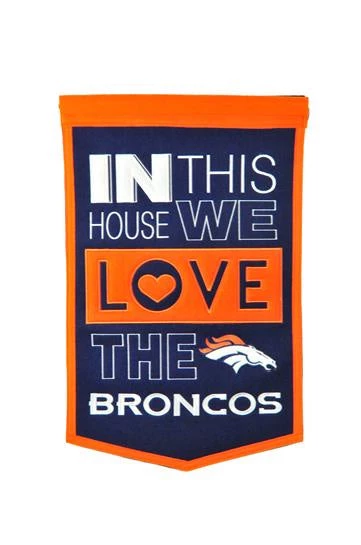 In This House We Love The Broncos! This NFL Denver Broncos Love Banner measures 15” wide by 22” Long. Made of wool and professionally embroidered. Any fan would be proud to display this in their home