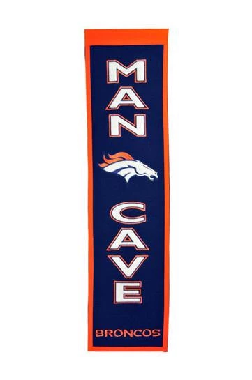 Denver Broncos Mancave Banner is perfect for any office, home or sports den! Banner measures 15” wide by 24” long, made of wool and professionally embroidered