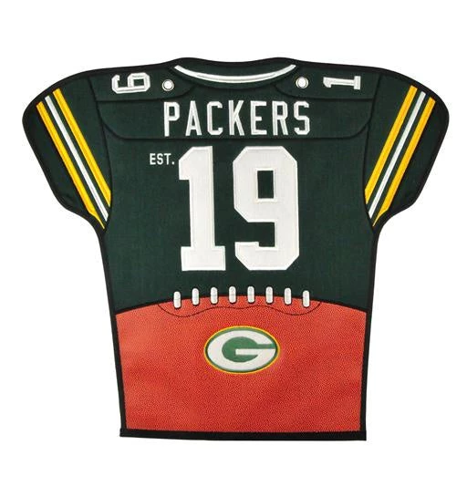 Green Bay Packers Jersey Banner measures 20″ wide by 18″ long, made of wool and professionally embroidered. Â Including an autograph section for your favorite NFL player.