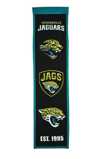 Jaguars NFL Heritage Banner measures 8″ wide by 32″ long and made of wool with professionally done embroidery.
