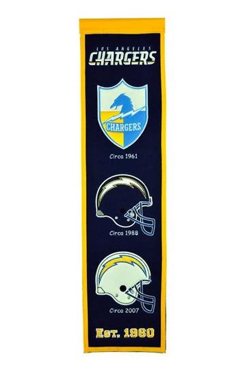 Los Angeles Chargers Heritage Banner measures 8” wide by 32” long, made of wool and professionally embroidered. Perfect for any NFL Chargers fan