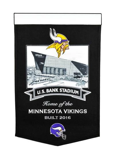 Minnesota Vikings US Bank Stadium Banner measures 15” wide by 24” long, made of wool and professionally embroidered. A sure favorite for your Vikings fan