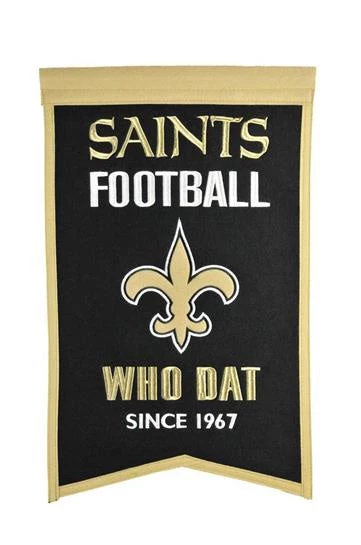 New Orleans Saints Franchise Banner is a very good look and high quality piece that will look great in your mancave or office! Show your NFL friends who you cheer for on Sundays! Measures 14” wide by 22” long. Made of wool.