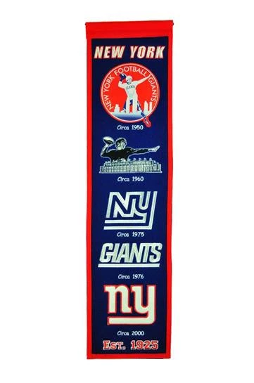 New York Giants Heritage Banner is sure to excite the Giants fan in your life! Our officially licensed NFL banner measures 8” wide by 32” long and is made of wool and professionally embroidered