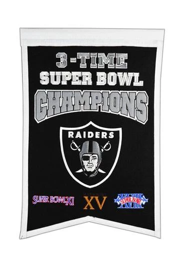 Raiders Super Bowl Champions Banner is a must have for any serious NFL fan. Measures 14″ wide by 22” long, made of wool and professionally embroidered.