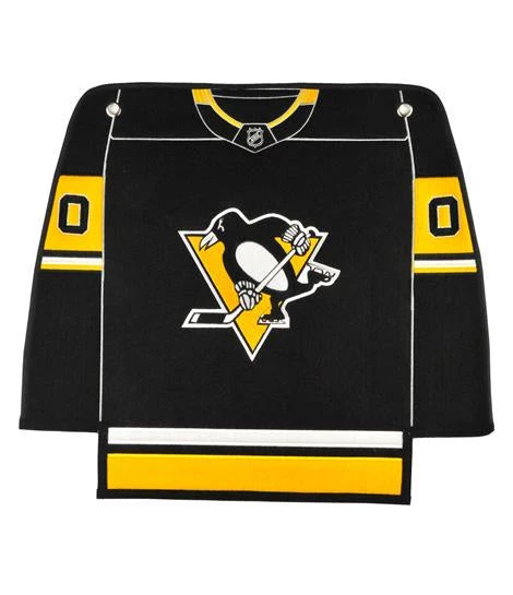 Pittsburgh Penguins Jersey Banner measures 13″ wide by 32″ long, made of wool and professionally embroidered.