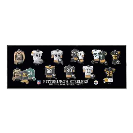 Pittsburgh Steelers Legacy Uniform Plaque shows the progression of the team uniform over the years. Â Measures 24″ wide by 8″ high.