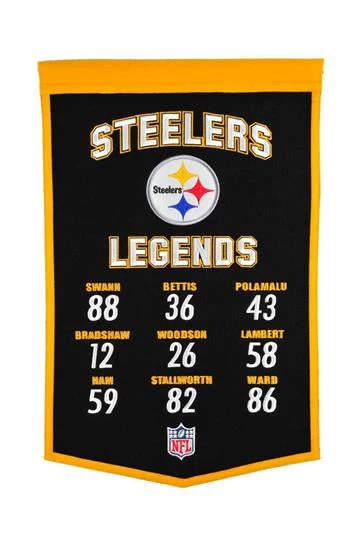 Pittsburgh Steelers Legends Banner measures 15” wide by 24” long, made of wool and professionally embroidered. Live the Legend! Go Steelers