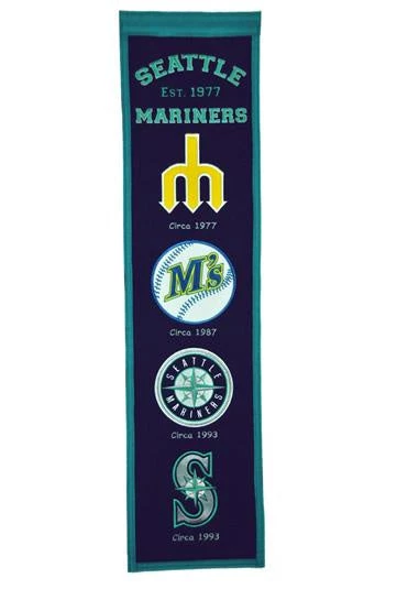 Seattle Mariners Heritage Banner measures 8″ wide by 32″ long, made of wool and professionally embroidered.