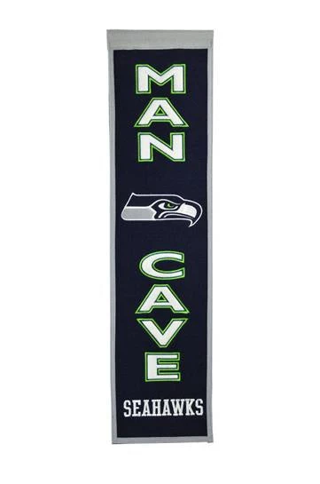 Seattle Seahawks Mancave banner is the perfect gift for the 12th fan in your home! Made of wool. Measures 8” wide by 32” long.