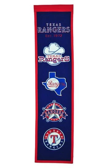 Texas Rangers Heritage Banner is officially licensed by MLB, made of wool and professionally embroidered. Measures 8” wide by 32” long